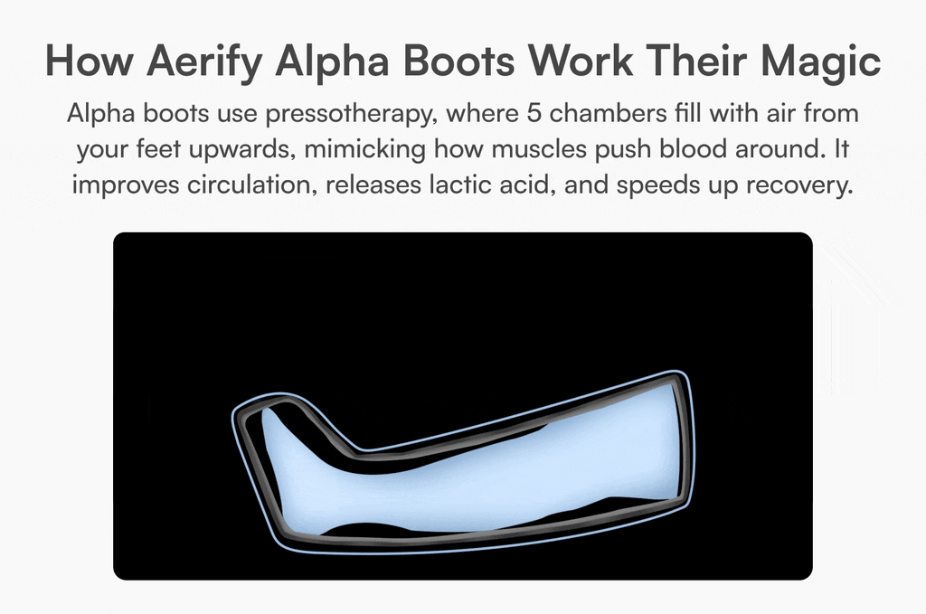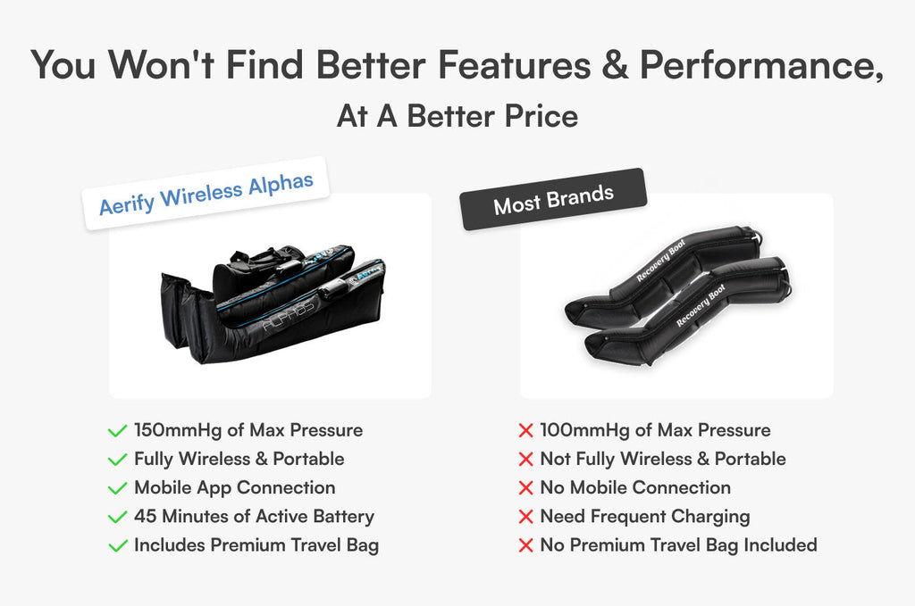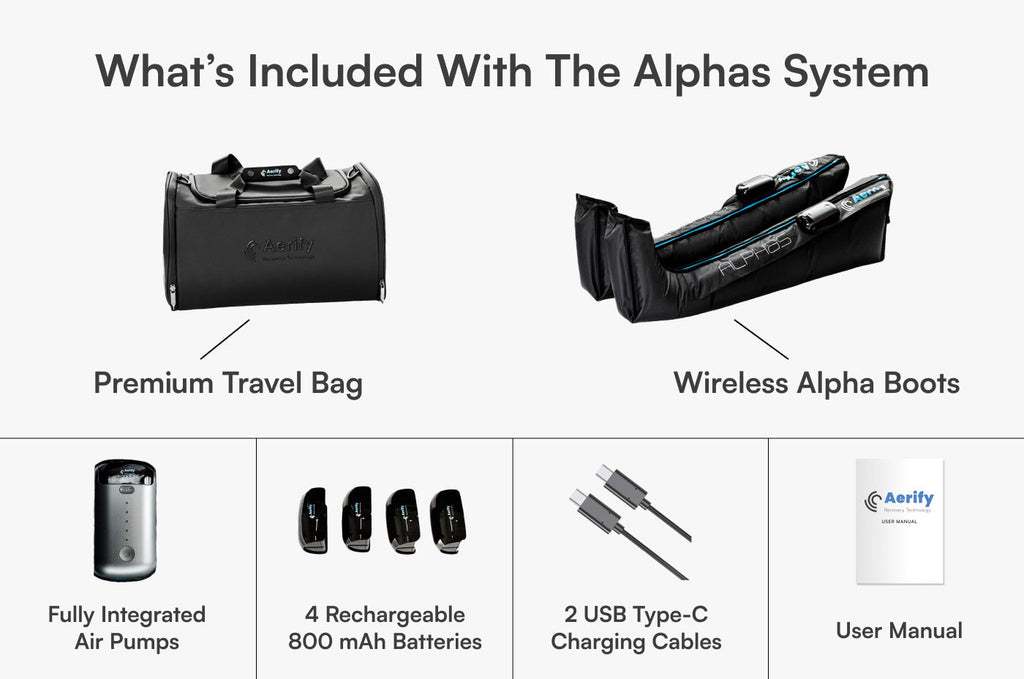 Aerify’s Wireless Alphas Compression Boots bring pro-level muscle recovery and soreness relief without the cords or cables. With app connectivity, deep 150mmHg compression, and a lightweight travel bag, you can take elite-level leg recovery wherever you go.